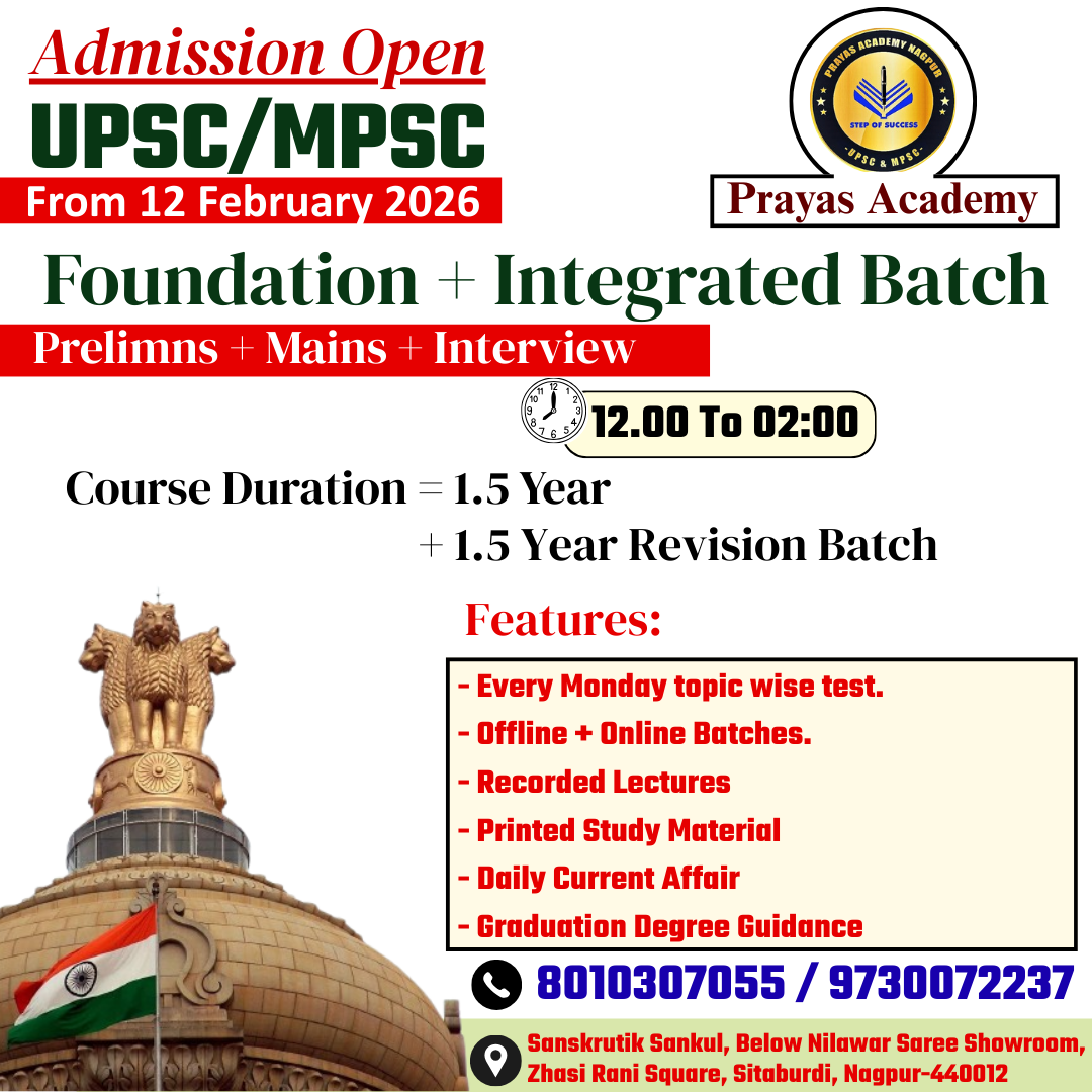 📢 Official Admission Announcement Admissions are now open at Prayas Academy, Nagpur for the UPSC / MPSC Foundation + Integrated Batch. 📅 Batch Commencement: 12 February 2026 This comprehensive course is designed to cover Prelims, Mains, and Interview stages with a structured and result-oriented approach. ⏰ Class Timings: 12.00 PM to 02.00 PM 📘 Course Duration: 1.5 Years + 1.5 Years Revision Batch Key Features: • Every Monday topic-wise test • Offline and Online batches available • Recorded lectures for revision • Printed study material • Daily current affairs updates • Graduation degree guidance Enroll now to begin your focused and systematic preparation for UPSC and MPSC examinations under expert guidance. 📞 Contact: 8010307055 / 9730072237 📍 Address: Sanskrutik Sankul, Below Nilawar Saree Showroom, Jhansi Rani Square, Sitabuldi, Nagpur – 440012 Prayas Academy – Step of Success