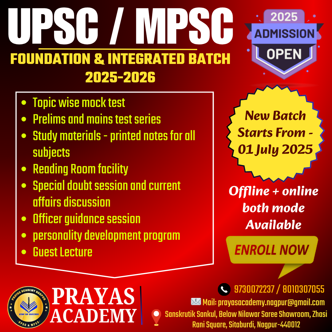 Best UPSC / MPSC Classes in Nagpur!! 🌟 Ready to Achieve Your MPSC / UPSC Dream? 🌟 ✅ Prayas Academy announces FOUNDATION & INTEGRATED BATCH 2025-26 🎯 New Batch starts from: 01 July 2025 📌 Modes: Offline + Online ✨ Why Choose Us? 🔹 Topic-wise mock tests 🔹 Prelims + Mains test series 🔹 Printed study notes for all subjects 🔹 Reading room facility 🔹 Doubt sessions & current affairs discussions 🔹 Officer guidance & personality development 🔹 Guest lectures 📞 LIMITED SEATS! Enroll today — 9730072237 | 8010307055 📍 Location: Prayas Academy, Sitabuldi, Nagpur 🎯 Your First Step to Success Starts Here! 👉 Click to Enroll Now!