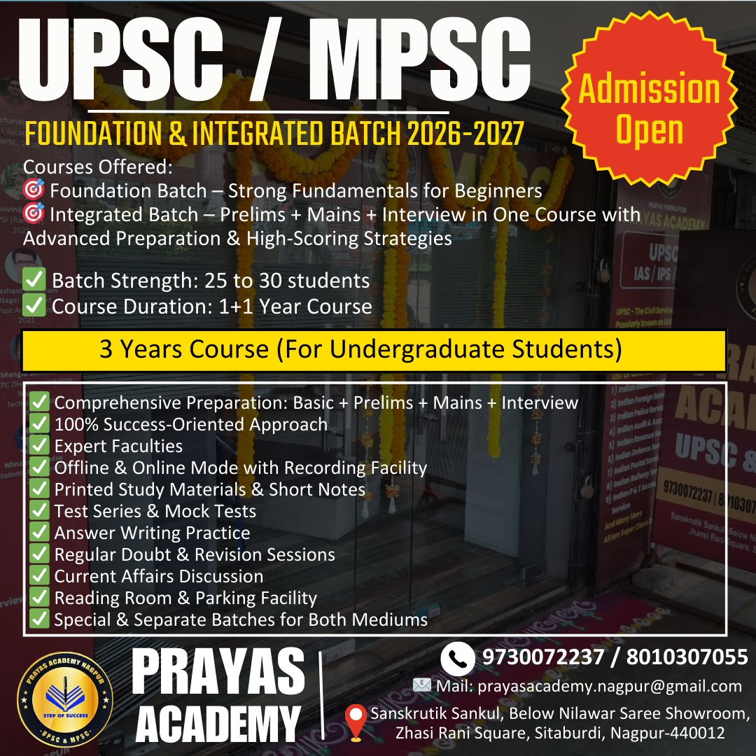 Nagpur's Best UPSC/MPSC Classes......!! 📢Key Features – UPSC / MPSC (2026–2027) Prayas Academy, Nagpur मध्ये UPSC / MPSC Foundation & Integrated Batch (2026–2027) साठी प्रवेश सुरू आहेत. 🔹 Courses Offered: • Foundation Batch – Beginners साठी मजबूत पाया • Integrated Batch – Prelims + Mains + Interview (One Course) 🔹 Key Highlights: ✅ Batch Strength: 25–30 Students ✅ Course Duration: 1+1 Year ✅ 3 Years Course for Undergraduate Students ✅ Comprehensive Preparation (Basics to Interview) ✅ Expert Faculties ✅ Offline & Online Classes with Recording ✅ Printed Study Material & Short Notes ✅ Test Series, Mock Tests & Answer Writing Practice ✅ Regular Doubt Clearing & Revision Sessions ✅ Separate Batches for Marathi & English Medium 📍 Address: Sanskruitik Sankul, Below Nilawar Saree Showroom, Zhashi Rani Square, Sitaburdi, Nagpur – 440012 📞 Contact: 9730072237 / 8010307055 📧 Email: prayasacademy.nagpur@gmail.com ✨ Limited seats available. Enroll early!