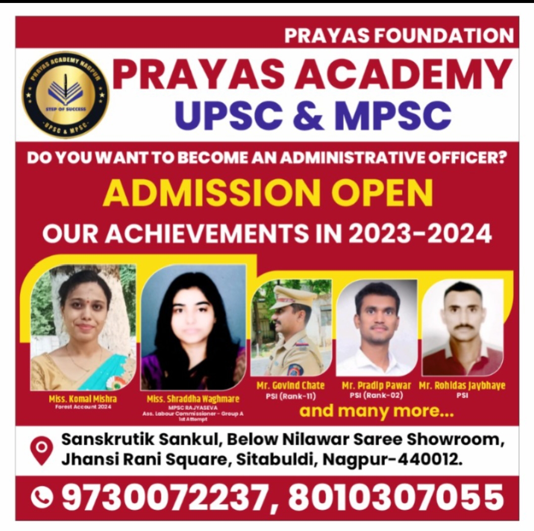 PRAYAS ACADEMY UPSC & MPSC 🎯 JOIN OUR UPSC & MPSC FOUNDATION AND INTEGRATED BATCH 2024 - 2025 ADMISSION OPEN Batch design Batch strength 25 to 30 1+1 Year duration course & 3 years duration course for undergraduate students Basic + Prelims + Mains + Interview 100% success Expert faculties Offline & Online mode with recording facility Printed study materials Short notes Test series Mock tests Writing practice Doubt sessions Revision sessions Current affairs discussion Reading room facility Parking facility Special & separate batches with both medium Admission on the basis of first come first serve Don't miss this opportunity to boost your preparation and achieve your goal. FOUNDATION+INTEGRATED BATCHES FOR UPSC & MPSC MPSC Rajyaseva Batch : 09:00 AM to 11 :00 AM UPSC Batch : 05:00 PM to 07:00 PM Reserve your seat Visit - www.prayas.academy Call - 09730072237 Mail us - prayasacademy.nagpur@gmail.com #Admission Open Join Prayas Academy for 100% success! Address: Prayas Academy Sanskrutik Sankul Complex, Zhashi Rani Square, below Nilawar Sadi Showroom, Sitabuldi, Nagpur, Maharashtra 440012 #mpsc #upsc #ias #ips #ifs #mpscmains #mpscprelims #mains #mockinterview #mpsccombine #psi #sti #aso #mpscguide #mpscnagpur #mpsctricks #mpscmotivation #mpscexam #mpscmaterial #mpscclasses #mpscinstitute #mpscinterview #mpsconline #mpscoffline #maharashtra #nagpur #mpscclassesnearme #bestmpscclasses #bestmpsc institute #mpsctestseries #recordedclasses #pranaysir #prayasacademy