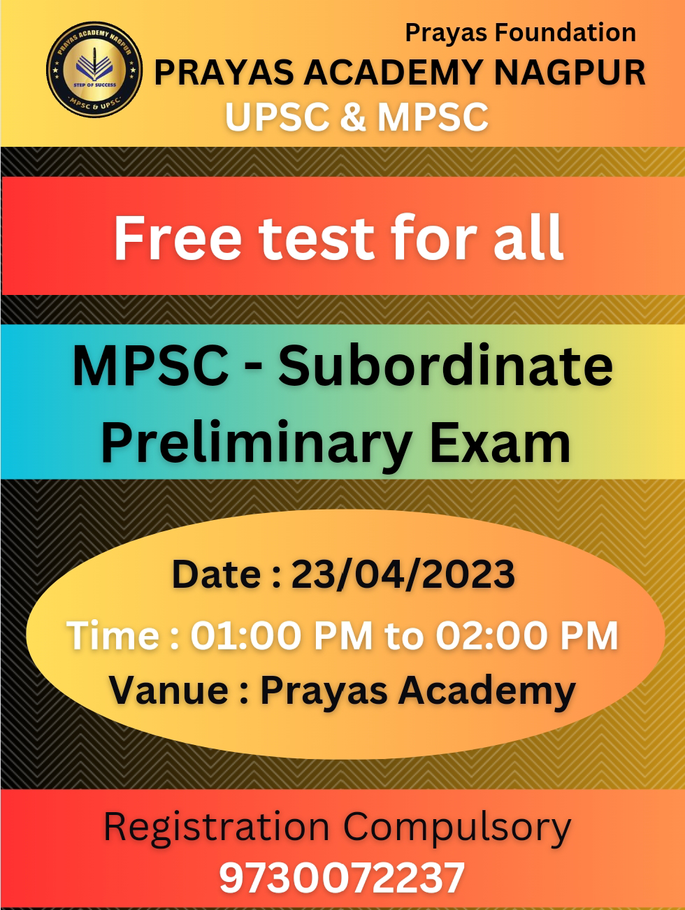 प्रयास फाऊंडेशन प्रयास अकॅडमी UPSC & MPSC विद्यार्थ्यांसाठी आवश्यक सूचना 🔴🔴🔴 उद्या दिनांक २३/०४/२०२३ रोजी, महाराष्ट्र अराजपत्रित (गट ब, क) संयुक्त पूर्व परीक्षा २०२३ च्या तयारिकरिता निःशुल्क सराव पेपर आयोजित करण्यात आला आहे कृपया सर्व विद्यार्थ्यांनी ह्याची नोंद घ्यावी. आणि जे विध्यार्थी इच्छुक असतील त्यांनी ह्याचा लाभ घ्यावा. वेळ : दुपारी, १ ते २ चर्चा सत्र : दुपारी, २ ते ५ स्थान : प्रयास अकॅडमी *नावनोंदणी अनिवार्य* ९७३००७२२३७ धन्यवाद!!